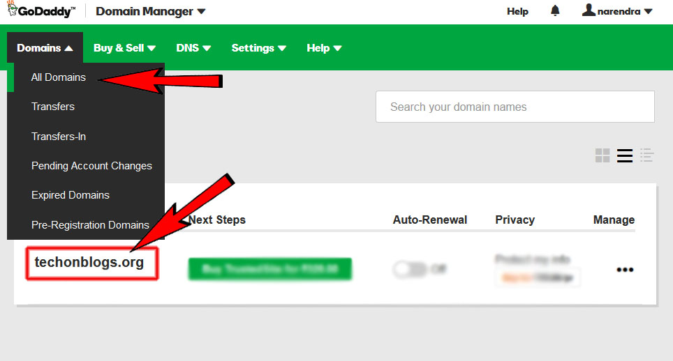- Click on the domain name which you have purchased inside your dashboard, and you will be on Manage domain page.